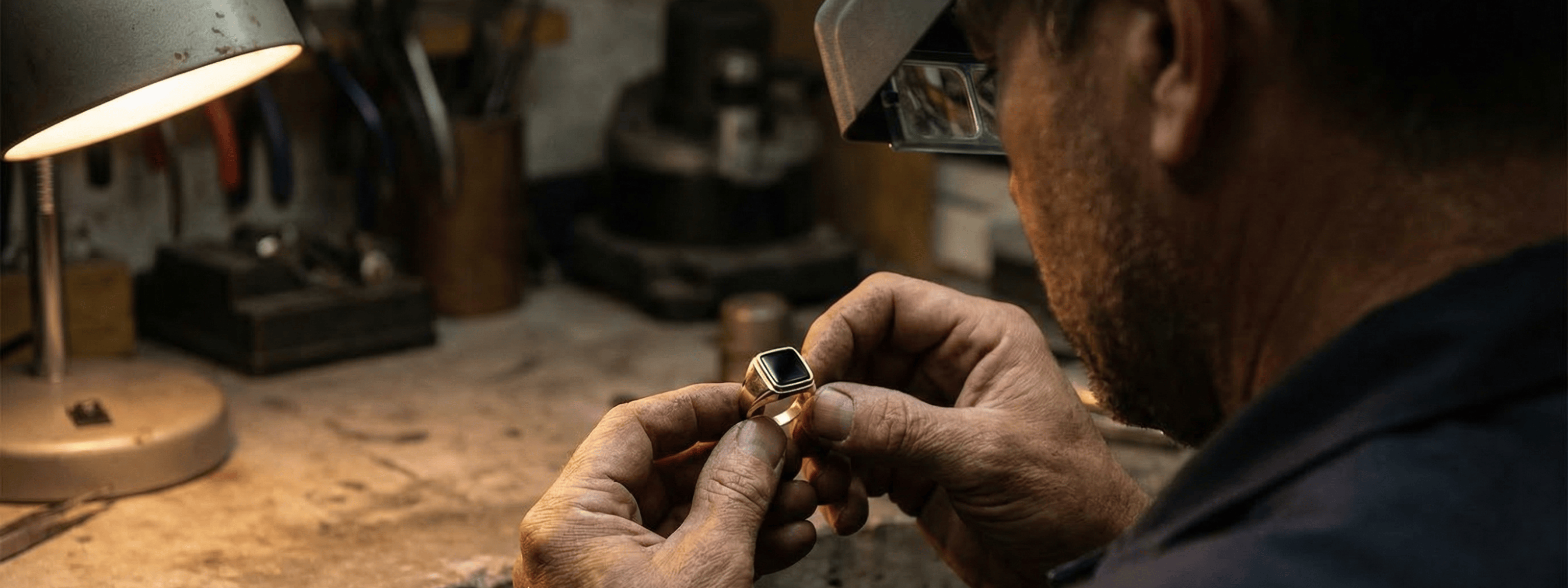 "Cadeau pour la promotion de mon mari, version dorée avec rubis seul et chevrons sur les côtés. Le rouge sur fond doré, c'est net et visible. Il la porte à l'annulaire tous les jours." ⭐⭐⭐⭐⭐
