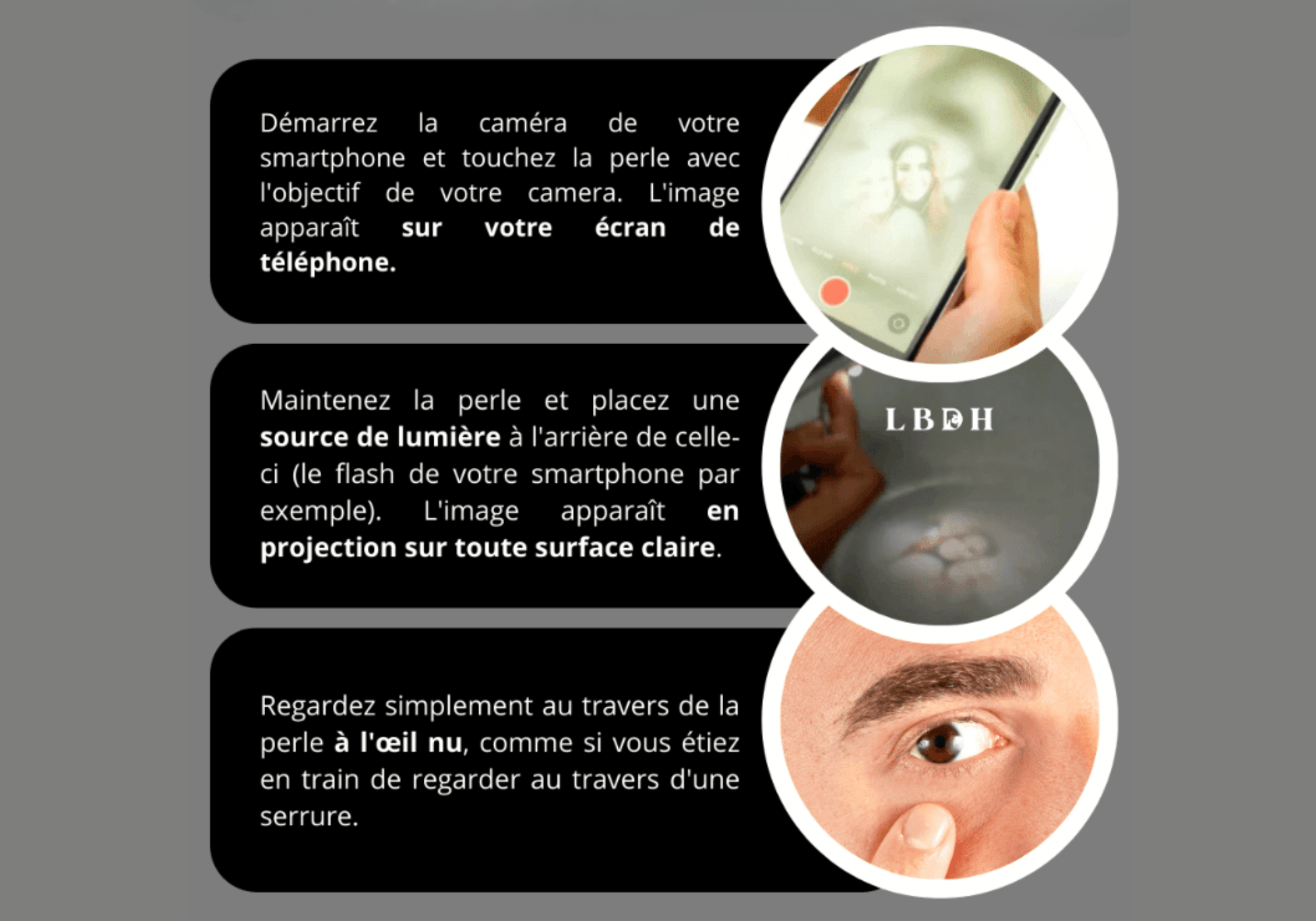 Notre collier photo personnalisé vous permet de regarder votre photo dans la perle de projection de trois façons différentes :
